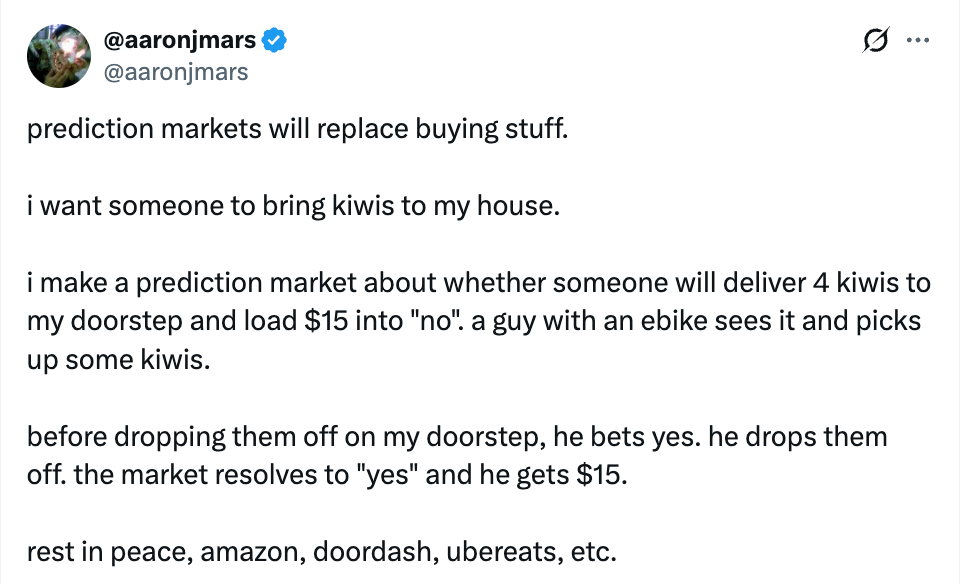 Our hottest happy hour conversation topic this week was on this idea. How far are prediction markets going to go? All the way? Let us know in the comments.