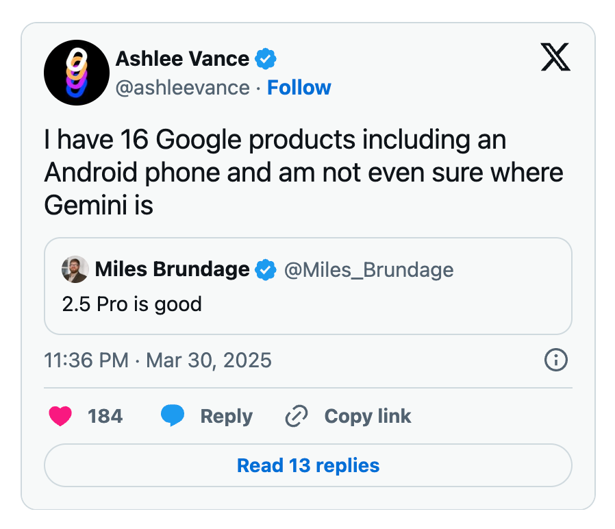 Theme of the week… new leadership in AI. The heads of AI at Meta and Google left and were replaced, respectively. I wonder if Google read our last week’s intro. If the new leadership figures this 👇🏼 out we’ll be sure to post an update.
