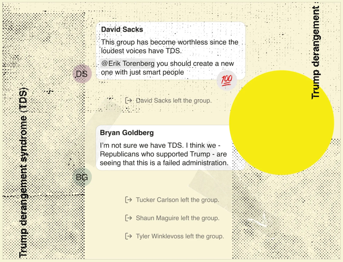 By mid-April, Sacks had had enough with Chatham House: “This group has become worthless since the loudest voices have TDS,” he wrote, shorthanding “Trump Derangement Syndrome.” Then he addressed Torenberg: “You should create a new one with just smart people.” Signal soon showed that three men had left the group: The Sequoia partner Shaun Maguire, the bitcoin billionaire Tyler Winklevoss, and Carlson.