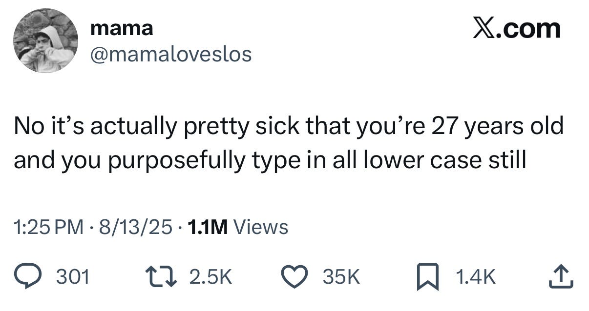 this is old news we know. but mama subtweeting relay and its readers here was a serious personal attack — don’t take this from us. aesthetic texting? please. whats the big deal? lower case texting is actually good for the brain and resistance training. think, digital creatine. some are saying they heard it on dr andrew huberman’s show recently. the new bio stack: creatine, gallons, cadence electrolytes, and lower case texting. I don’t make the rules.