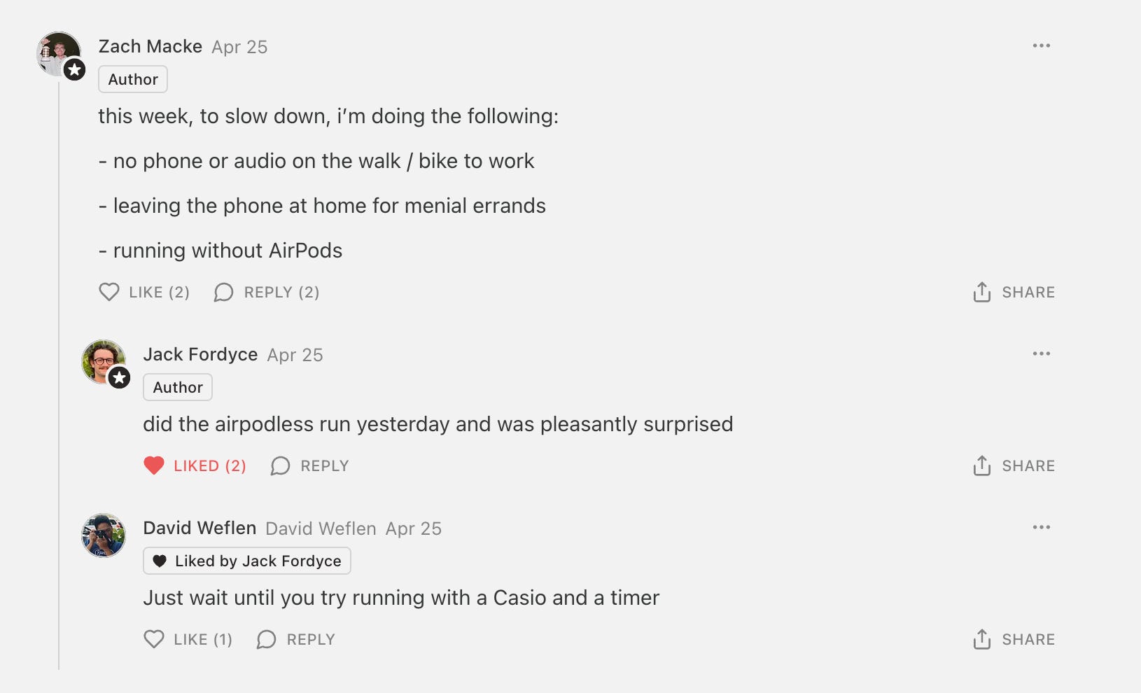 Most importantly, it has forced me to just be bored. My mind feels more at peace because it can catch up during the day’s baked-in downtime. It turns out, after a really long day at work, or on a Saturday morning walk to the coffee shop, I really don’t need political commentary, someone else’s fun and easy banter, or a readout of today’s market moving news. Instead, I can just be a pedestrian—looking around and listening.