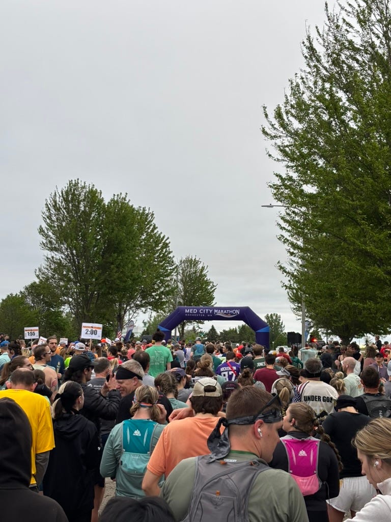 I love cool gear and niche brands as much as the next person, believe me I do (I'm wearing Minted New York shorts while writing this). As fun as some of that stuff is, it was refreshing to see a relatively small group of runners standing in the nearly freezing-cold morning wind hiding behind a small-town America brick building waiting for our race to start. No one concerned with the glamour of the latest drop or sleekest kit. Just doing it to do it.